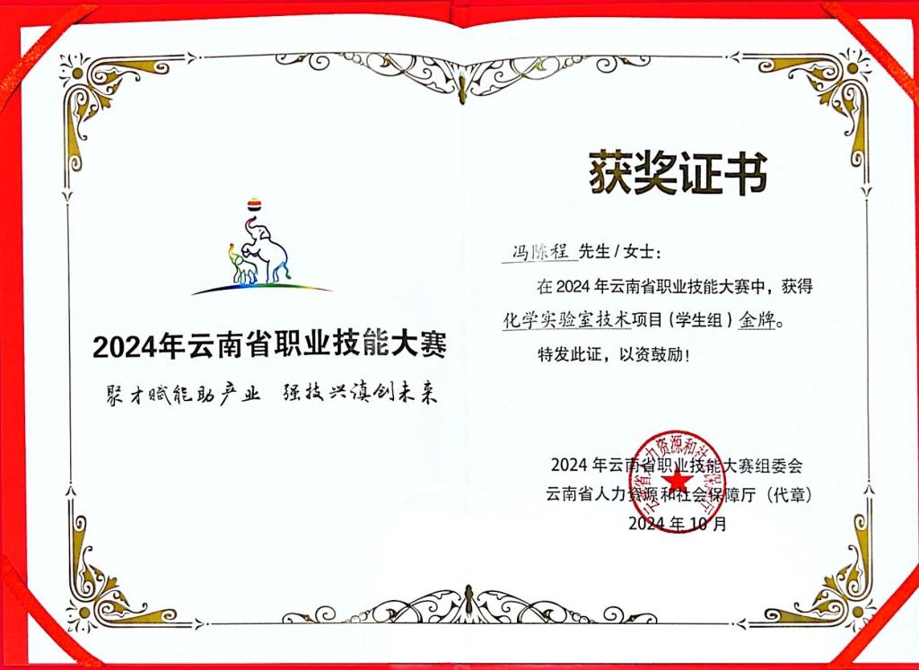 10月15日至17日,由云南省人力资源和社会保障厅、省教育厅、省总工会联合主办的2024年云南省职业技能大赛在昆举行。永利官网化学化工学院学生冯陈程(指导教师:邓秀君)在“云南省职业技能大赛-化学实验室技术”学生组中以总评分排名第一的优异成绩,获得金奖,将代表云南省参加2025年举行的第三届全国技能大赛。