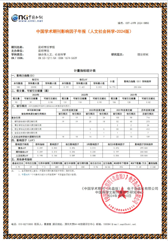 据中国知网最新发布的《中国学术期刊影响因子年报》(人文社会科学•2024版),《3044am永利官网学报》影响因子数据及全国排位大幅提升:期刊综合影响因子为0.313,比2023年版的0.216提升45%;复合影响因子0.553,比2023年版的0.492提升12.4%;影响力指数在全国社科综合类期刊中排位为250/604,比2023年版的268位提升了18位。影响因子在云南省文理综合刊中排名第一。