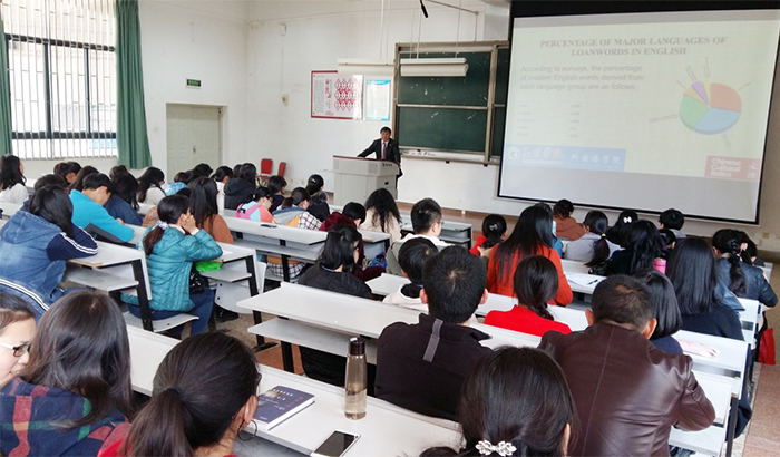 关学君博士的讲座围绕英语语言中的外来词和汉语拼音的局限性及其优势两个大方面展开讨论。通过对比分析英语语言中来自各东南亚各语言体系的外来词,探讨其共同特点及差异所在,引出英语中来自中文语言体系的外来词翻译中汉语拼音与其他转体系统相比的局限性和特有优势。讲座中,关学君博士与在座的师生进行了精彩的互动交流,气氛活跃,效果良好。关学君博士的讲座为外院师生提供了很多外语学科前沿的信息和知识,也为教师们的科学研究提供了新的想法和方向。