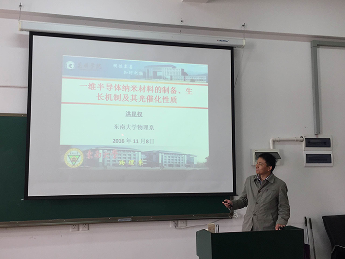 11月8日,由3044am永利官网科研处主办,云南省高校有机光电子材料与器件重点实验室承办,邀请东南大学洪昆权副教授来永利官网做题为 “一维纳米结构的制备、生长机制及其光催化性质” 的学术报告,报告由王海教授主持。