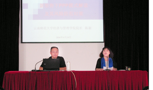 6月24日,由中共云南省委宣传部、云南省社会科学界联合会主办,3044am永利官网昆明科学发展研究院承办的“云岭大讲堂”3044am永利官网第4讲在永利官网惟行楼举办。此次讲座邀请云南师范大学经济与管理学院院长陈新教授,做《新形势下PPP模式解读及其风险防范对策》主题讲座。昆明科学发展研究院副院长沈艳萍教授主持讲座。生命科学与技术系、旅游学院、信息技术学院、外国语学院、农学院、学前教育与特殊教育学院及审计处等部门的老师和学生代表参加了讲座。云南电视台对此次讲座进行全程摄录。