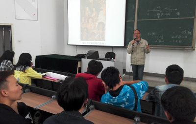 汤海涛教授从云南地理、气候、历史、人文、民族民俗、当代美术创作发展等诸多方面对比性的介绍了云南美术创作的独特之处,强调了形式感和艺术表现语言的民族性方面在云南美术创作中的重要性和决定性作用。其风趣幽默的表达方式和大量文献资料的有机串联让在场的师生都得到了很多启发,也为大家增添了对云南美术创作未来发展的信心,起到了帮助学生系统了解云南当代美术创作的线索,开拓学生视野,树立专业自信心等良好作用。